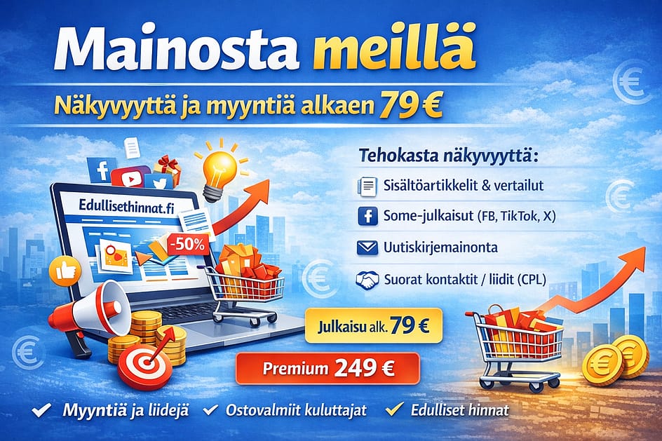 Edullisethinnat.fi tarjoaa yrityksille tehokkaan ja kustannustehokkaan tavan tavoittaa hintatietoiset ja ostovalmiit suomalaiset. Me emme myy pelkkiä näyttöjä – autamme yrityksiä saamaan liidejä, myyntiä ja mitattavia tuloksia.